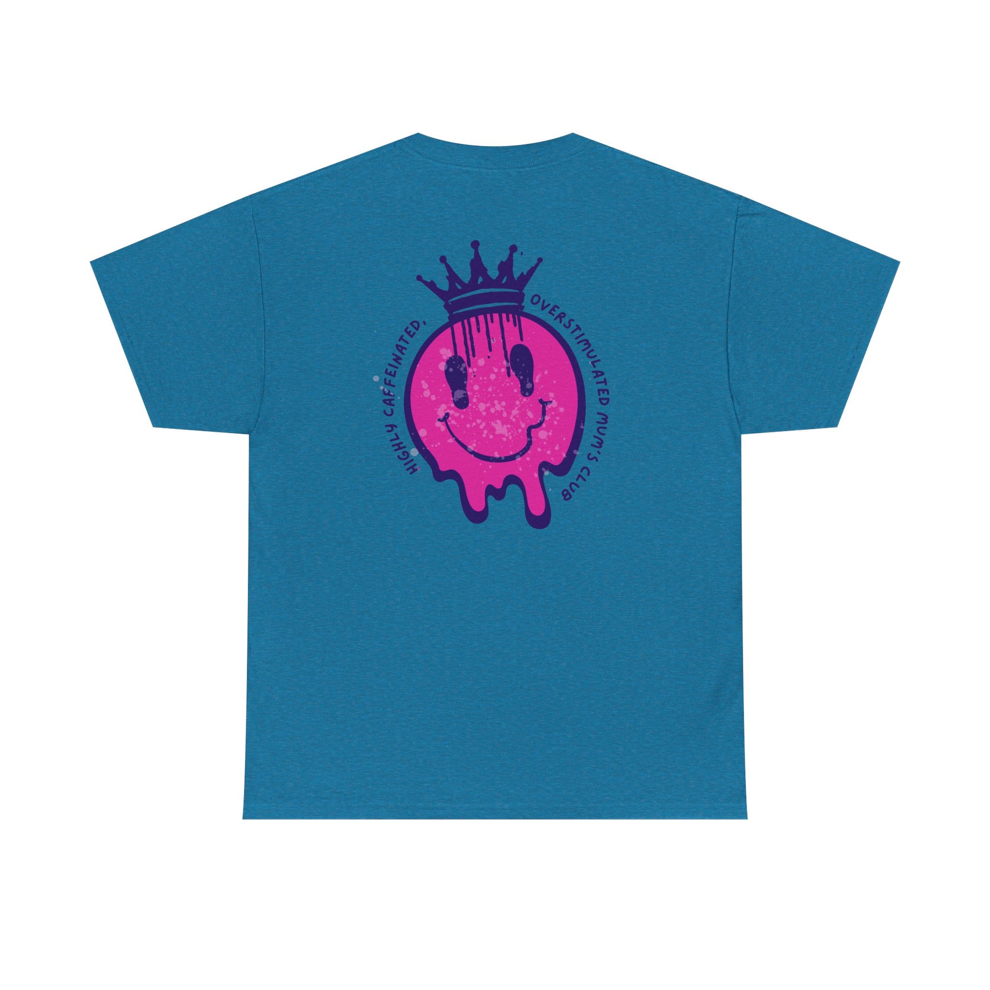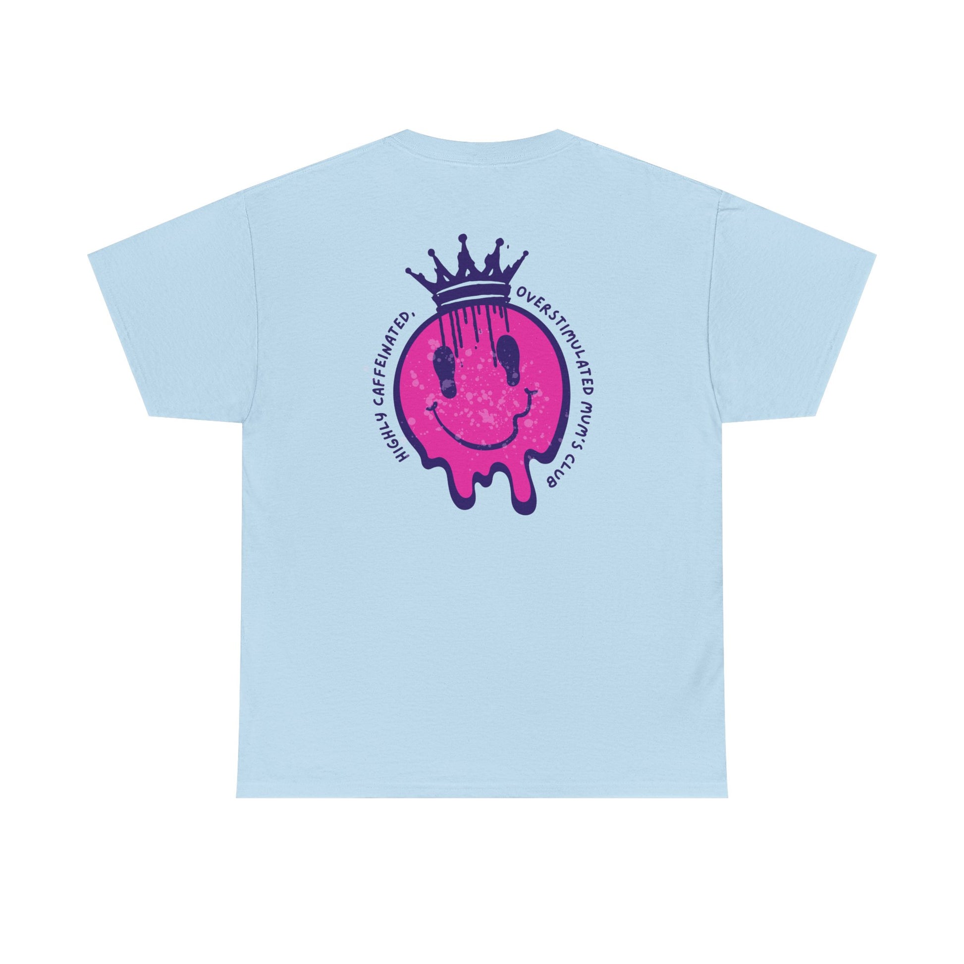 - Large smiley graphic printed on back with the text highly caffeinated, overstimulated mum's club
